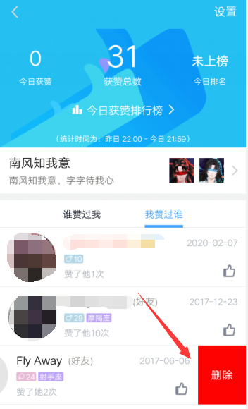 6、最后,在打开的界面里,用手点选某一点赞记录,并往左滑动即会出现删除这一选项,然后点击该删除选项即可。