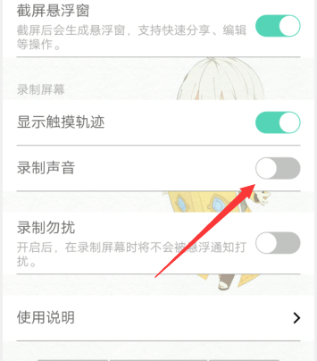 2、往下滑,找到录制声音,滑动滑块打开录制声音即可在录屏时录制声音。