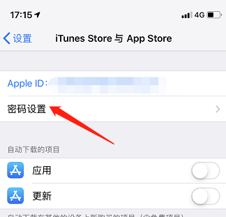 3、点击“iTunes Store 与 App Store”,在打开的页面中点击“密码设置”。