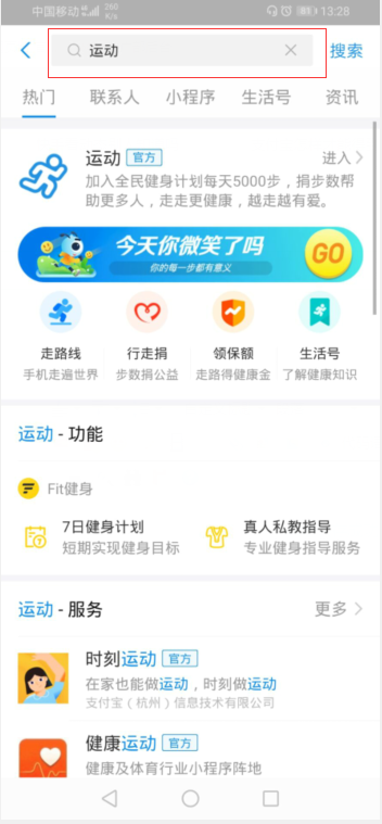 1、支付宝首页搜索“运动”,可以看到运动的标志,点击一下。