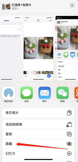 4、点开分享之后,就可以看见“隐藏”的选择项,如果要隐藏这张照片就可以直接点击。