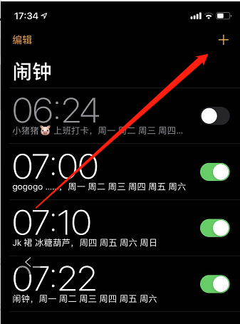 3、点击屏幕右上方【+】,添加新的闹钟;