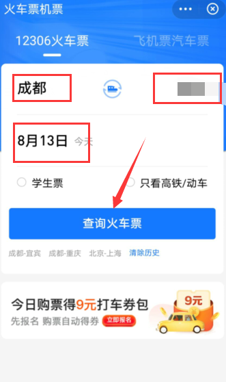 2、输入出发地、目的地以及时间,然后点击【查询火车票】。