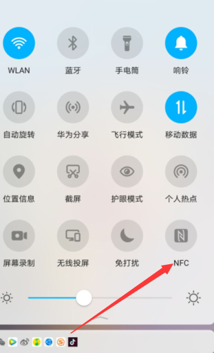 下滑手机的通知栏,找到并点击NFC选项,开启此功能后,只需要将自己的设备靠近另一台设备,即可实现交换数据;还可以使用NFC功能触碰付款,只需将手机靠近付款设备就可以了。