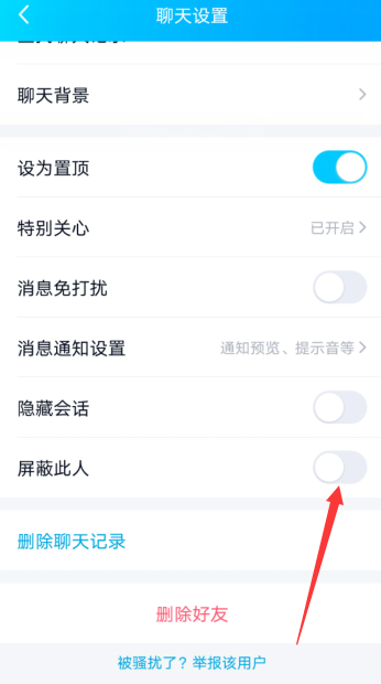 3、下滑,找到并打开【屏蔽此人】后面的按钮即可。