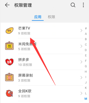 3、随后就会出现“权限管理”设置界面,选择点击“应用”选项中的“芒果TV”按钮;