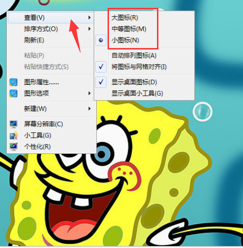 鼠标在电脑桌面空白处单击右键,选择查看,在弹出的对话框有“大图标”“中等图标”“小图标”,选择想要得图标即可。