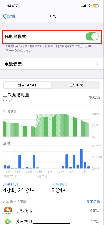 系统版本为iOS13.4,iPhone7动态壁纸不动是由于手机处于低电量模式下导致的,将其低电量模式关闭即可。其操作方法如下: