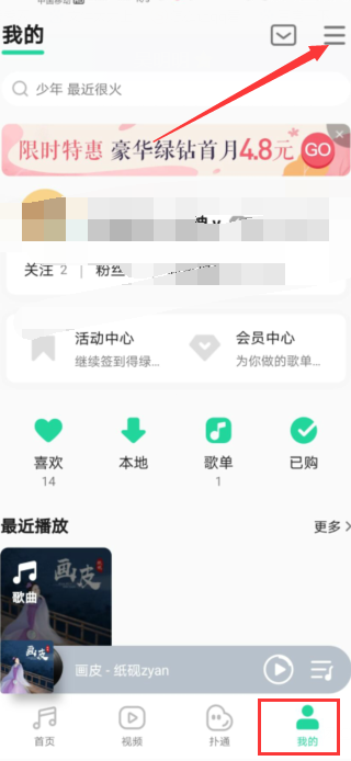 1、进入QQ音乐,切换至【我的】界面,然后点击左上角三横。