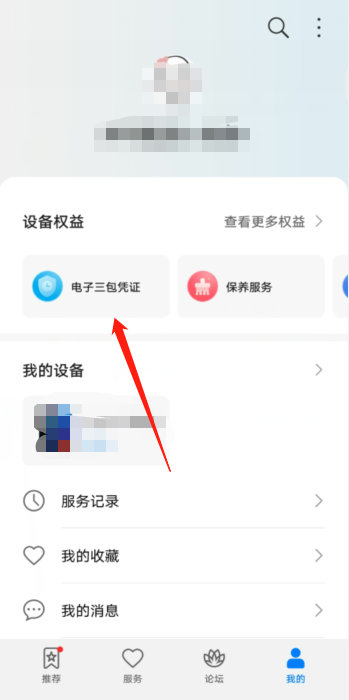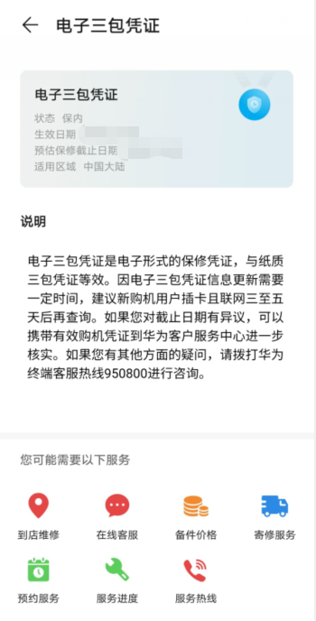 以系统版本EMUI10.1.0.92的华为Nova5手机为例,电子保修卡在服务里找,其方法是: