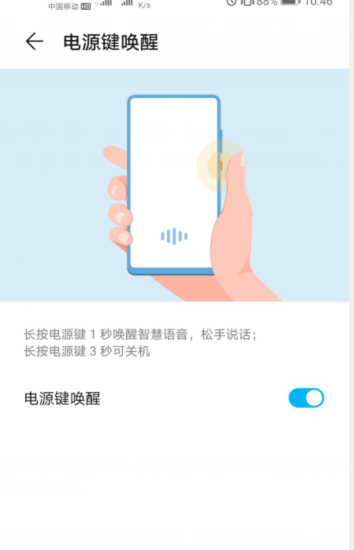 5、打开【电源键唤醒】右侧的开关,长按电源键1秒即可唤醒语音助手。