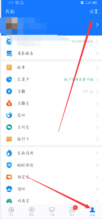 1、打开支付宝,点击右下角“我的”,然后点击“设置”。