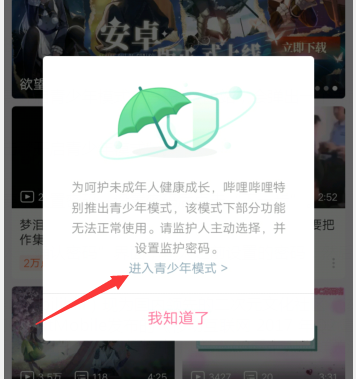 1、想要开启青少年模式,首先打开B站,会弹出一个界面,可以直接进入。