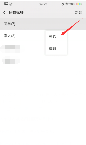 2、可以看到自己设置的部分人可见所形成的标签,长按标签出现删除,然后点击删除就可以了。