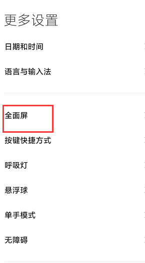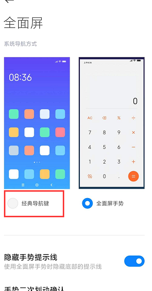 3、点击全面屏,在全面屏界面有两种系统导航方式。