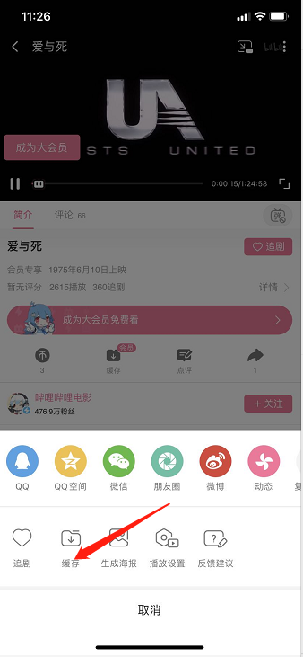3、这时在跳出的弹窗点击缓存选项,然后选择缓存的画质,选择好后点击要保存的视频条就可以了。
