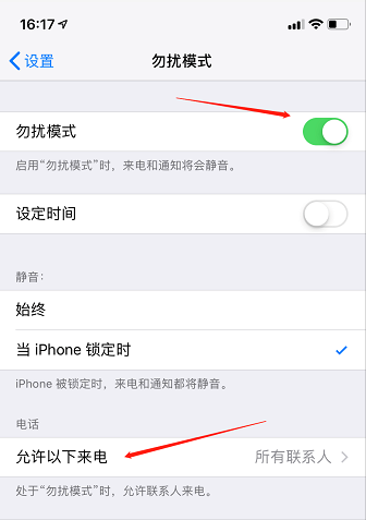 3、系统默认“勿扰模式”处于关闭状态,滑动右侧的开关按钮将“勿扰模式”开启;此时并点击下方“电话”中的“允许以下来电”选项,进入到详细的来电联系人允许设置。