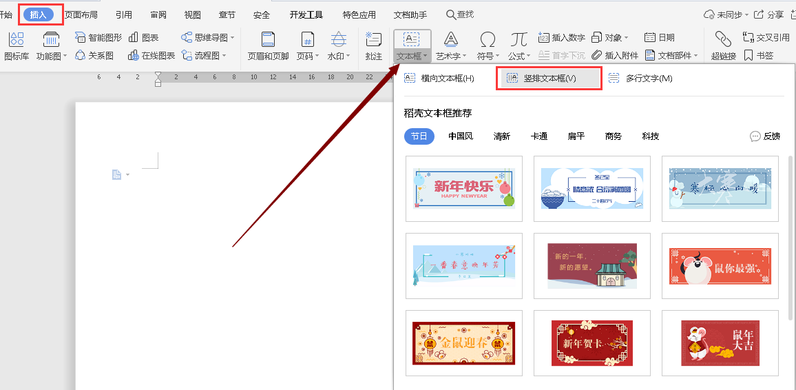 1、选择“插入”选项卡里的“竖排文本框”。