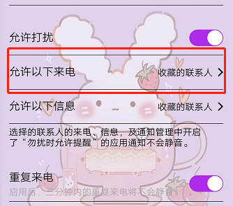 4、打开“勿扰模式”后,下面有一个“允许以下来电”,点击进入。