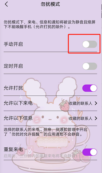 3、进入“勿扰模式”后,将“勿扰模式”打开。