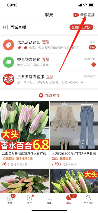 1、首先打开拼多多App进入主页,然后点击下方的“聊天”按钮;