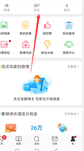 1、打开手机微博,点击我,然后选择关注。