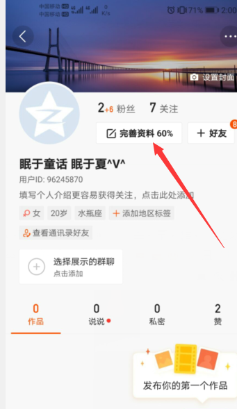 3、进入个人主页中,点击完善资料按钮。