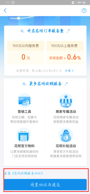 4、然后,点击花呗收钱后就会进入开通花呗收钱的界面。在这个界面并没有需要提供营业执照和门店信息的要求,只需要仔细阅读以下花呗收钱服务协议,点击同意协议并开通;