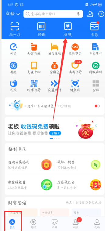 1、首先,打开手机支付宝应用,点击支付宝“首页”,在支付宝首页中,找到收钱这项,选中点击“收钱”即可;