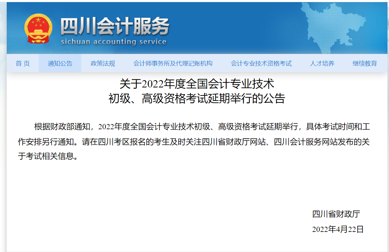 根据财政部通知,2022年度全国会计专业技术初级、高级资格考试延期举行,具体考试时间和工作安排另行通知。请在四川考区报名的考生及时关注四川省财政厅网站、四川会计服务网站发布的关于考试相关信息。