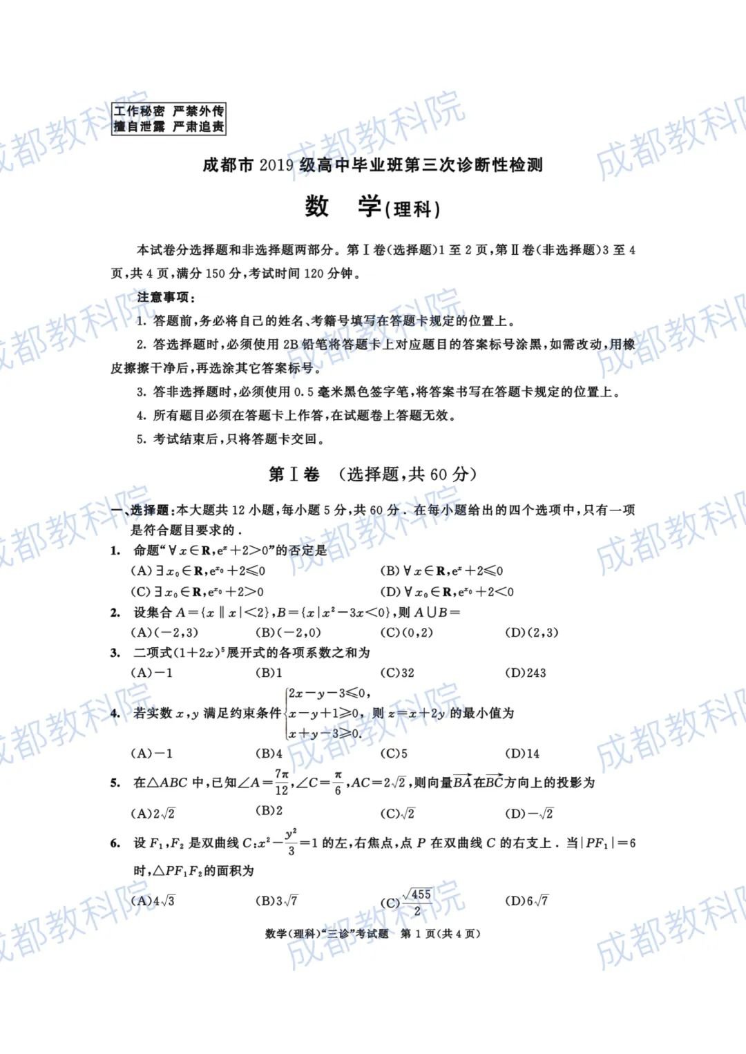 成都市2019级高中毕业班第三次诊断性检测数学(理科)
