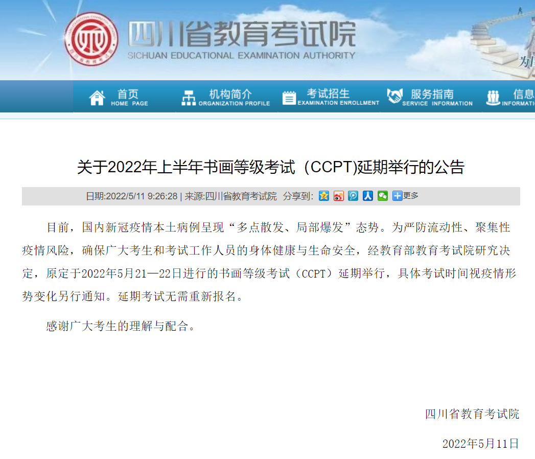 原定于2022年5月21—22日进行的书画等级考试(CCPT)延期举行,具体考试时间视疫情形势变化另行通知。延期考试无需重新报名。
