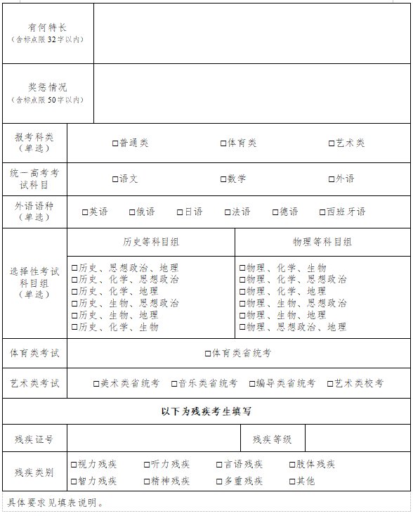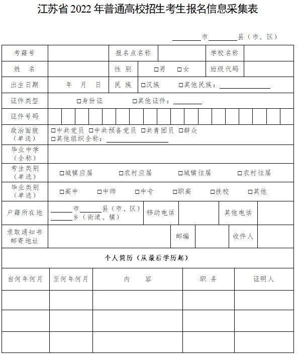《江苏省2022年普通高校招生考生报名信息采集表》填表说明