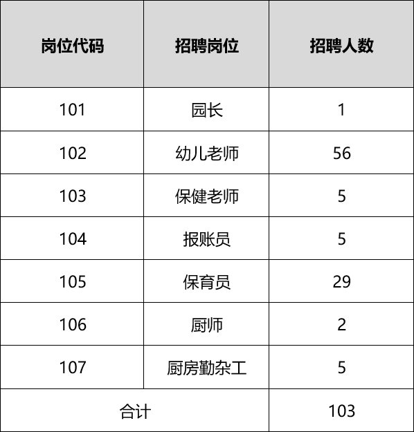 为加强街道幼儿园师资队伍建设,结合街道幼儿园岗位缺额情况,经南京市江北新区顶山街道党工委批准,决定面向社会公开招聘园长1名,幼儿教师56名,保健老师5名,以及幼儿园工作人员41名,共计103人。
