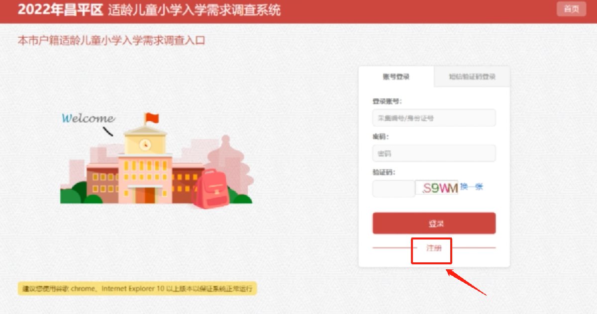 第一步,使用谷歌Chrome、lnternet Explorer 10以上版本的浏览器,登录昌平区适龄儿童小学入学需求调查系统 (网址:http://dctj.chpedu.net)。