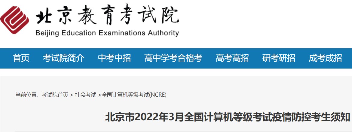 北京市2022年3月全国计算机等级考试将于3月26日至27日举行,为保障广大考生和考试工作人员生命安全和身体健康,请所有考生知悉、遵守、执行本项考试的新冠肺炎疫情防控要求。考生由于个人原因不符合疫情防控要求不能参加考试的,由考生本人承担全部责任。