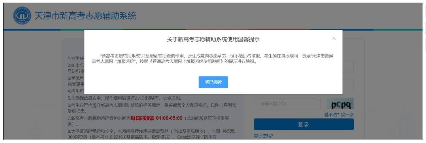 考生登录, 查看系统温馨提示,点击【我已阅读】后查看新高考志愿辅助系统登录说明,然后输入考生号、密码(密码和高考报名系统使用密码一致)和验证码,点击【登录】,即可登录系统。