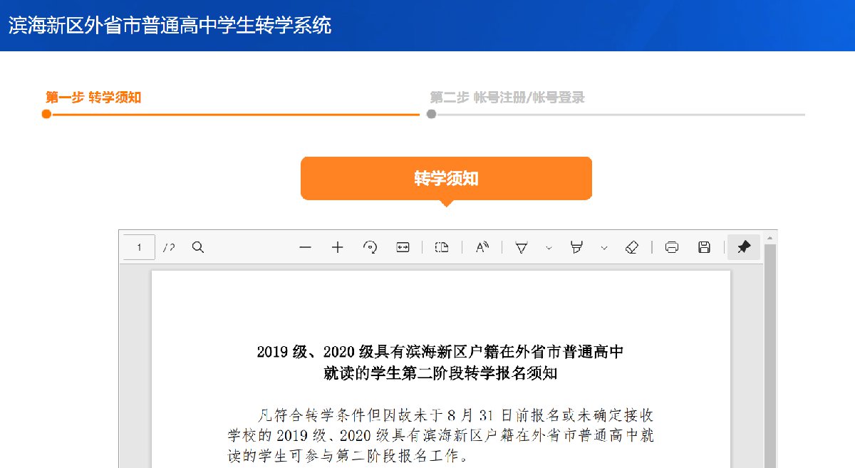 注意:凡符合转学条件但因故未于8月31日前报名或未确定接收学校的2019级、2020级具有滨海新区户籍在外省市普通高中就读的学生可参与第二阶段报名工作。