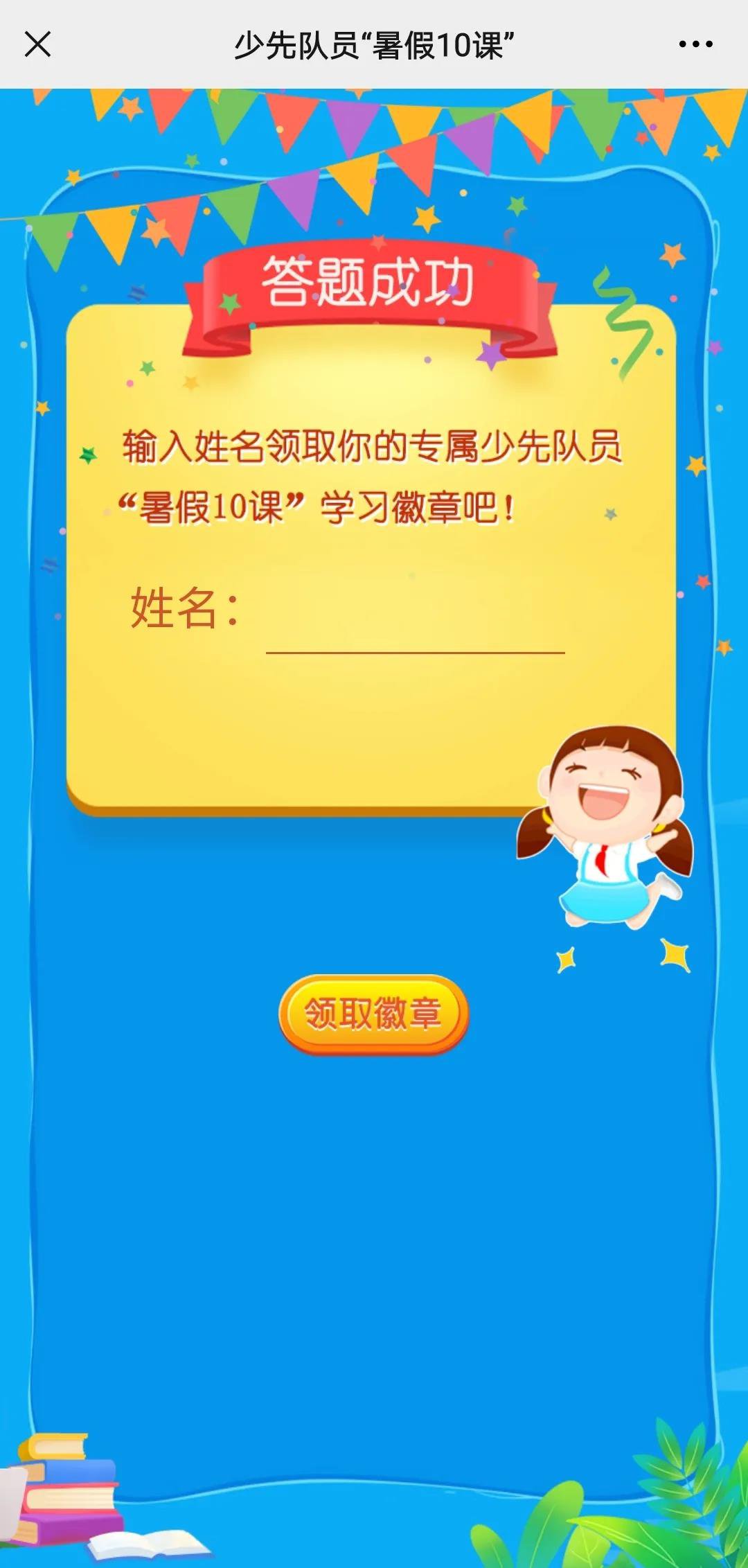 第四步:观看课程视频,观看完成后点击下方答题按钮,答题成功后输入姓名领取不同地区专属少先队员暑假学习徽章