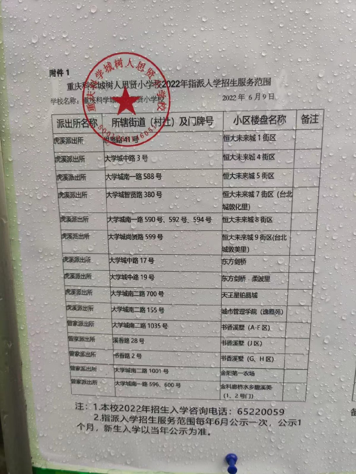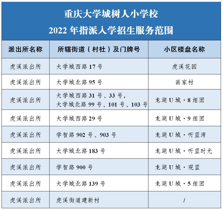 ① 重庆市沙坪坝区学智路647号、649号、651号、717号,学苑路137号,可在重庆大学城树人小学校、重庆大学城树人第二小学校选择入学;