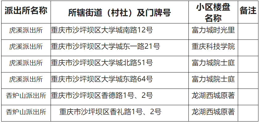 派出所名称 所辖街道(村社)及门牌号 小区楼盘名称 备注 虎溪派出所 重庆市沙坪坝区大学城中路38号 富力城地壹站 虎溪派出所 重庆市沙坪坝区大学城中路46号 富力城翰湖 虎溪派出所 重庆市沙坪坝区大学城中路48号 富力城春天里 虎溪派出所 重庆市沙坪坝区大学城中路50号 富力城幸福里 维多利亚别墅 虎溪派出所 重庆市沙坪坝区大学城中路52号 富力城公园别墅 虎溪派出所 重庆市沙坪坝区景阳路39号 富力城新一站 虎溪派出所 重庆市沙坪坝区景阳路56号 富力城蝶花岸 虎溪派出所 重庆市沙坪坝区盛德路943号 富力城书香里 虎溪派出所 重庆市沙坪坝区景苑路8号、12号 熙街一、二街区 虎溪派出所 重庆市沙坪坝区厚德路22号、24号 湖岸家园A、B区 注意:厚德路22号、厚德路24号的业主子女在2022、2023年入学时,在满足学位紧张学校招生条件下,可在大学城人民小学、大学城树人小学选择入学;二孩入学时可按“一户读同校”的原则自愿选择。