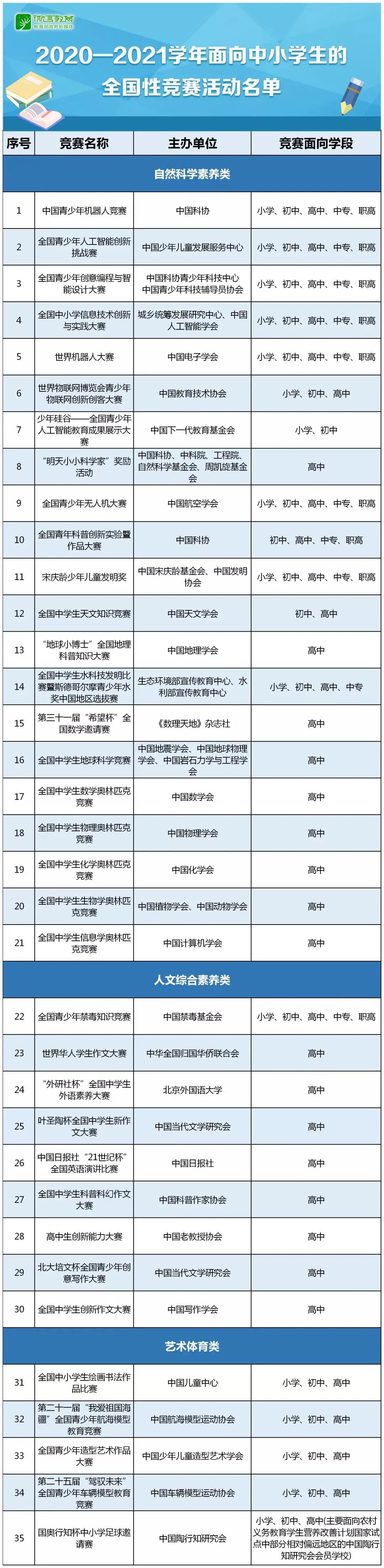 教育部公布了2020-2021学年面向中小学生的全国性竞赛活动名单,名单分为“自然科学素养类”“人文综合素养类”“艺术体育类”三类,共有“中国青少年机器人竞赛”等35项竞赛进入名单。