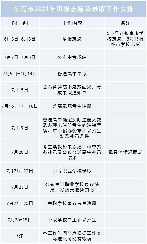 2021东莞市内学校填报志愿及确认志愿数据时间为6月3日至6月7日。外市中职学校填报志愿时间为6月8日,考生如无报考外市中职学校需要,则无需在6月8日再登录中招平台填报。