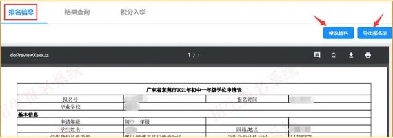 报名结束后,可点击“返回”,页面会显示学生申请表,请家长再次认真检查。如检查后发现信息错误,需要修改的,可以点击“修改资料”﹔重新进入填报页面修改提交;也可以下载或打印报名表存档。
