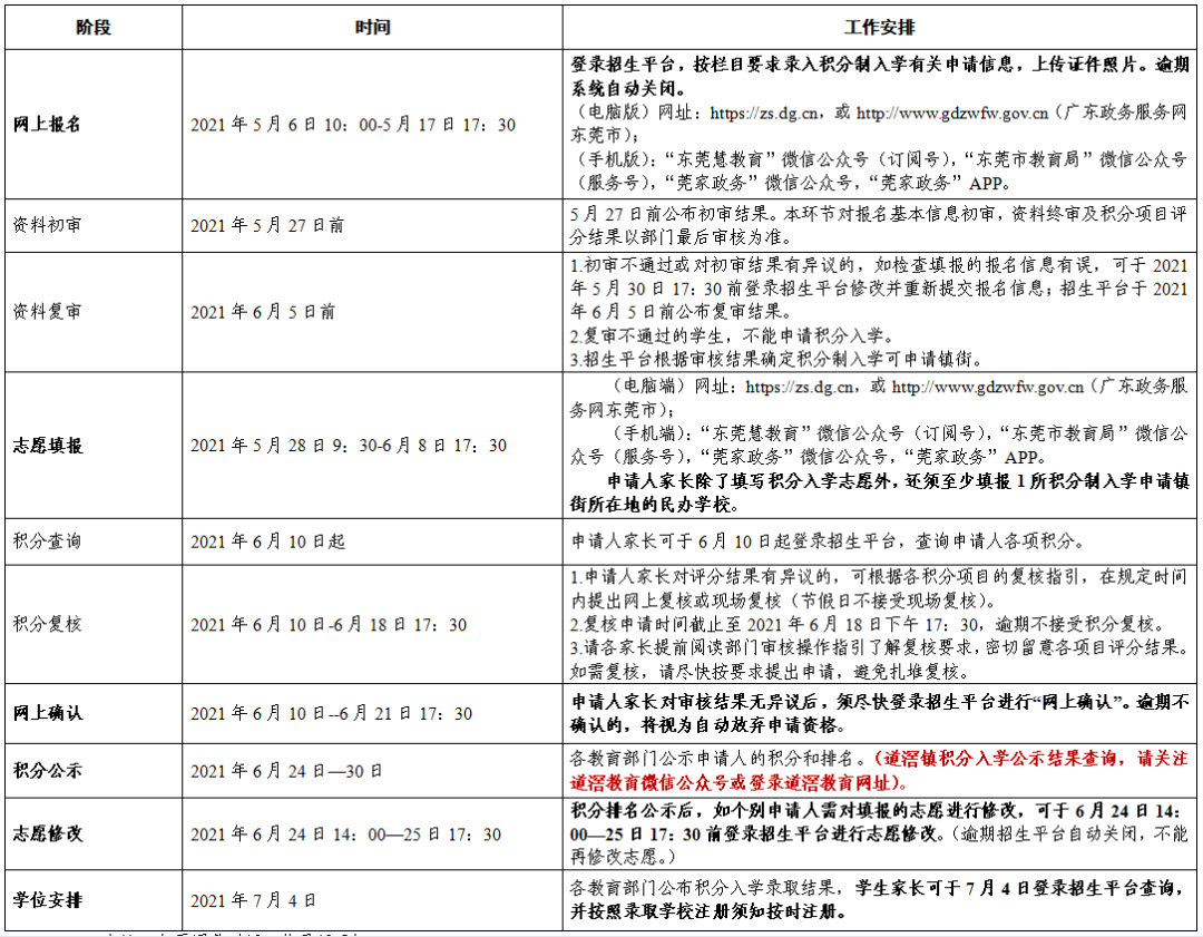 东莞市2021年积分制入学工作日程安排