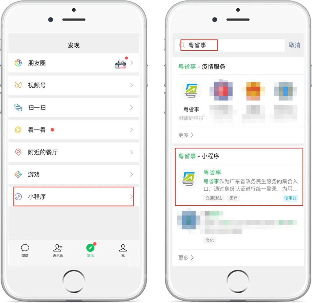 方式二:在微信发现页“小程序”搜索“粤省事”小程序,在首页的“抗击疫情”模块,点击“粤康码”即可进入该服务,出示粤康码。