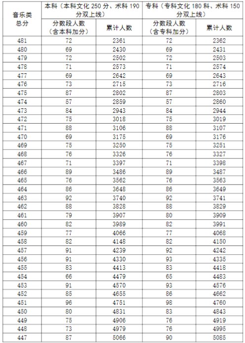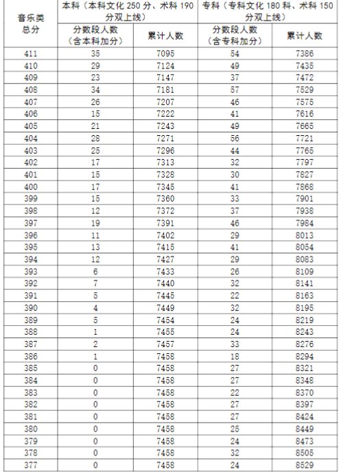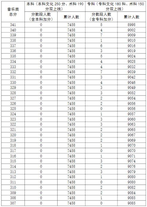 广东省2020年普通高考音乐类总分分段统计表(含本、专科层次加分):