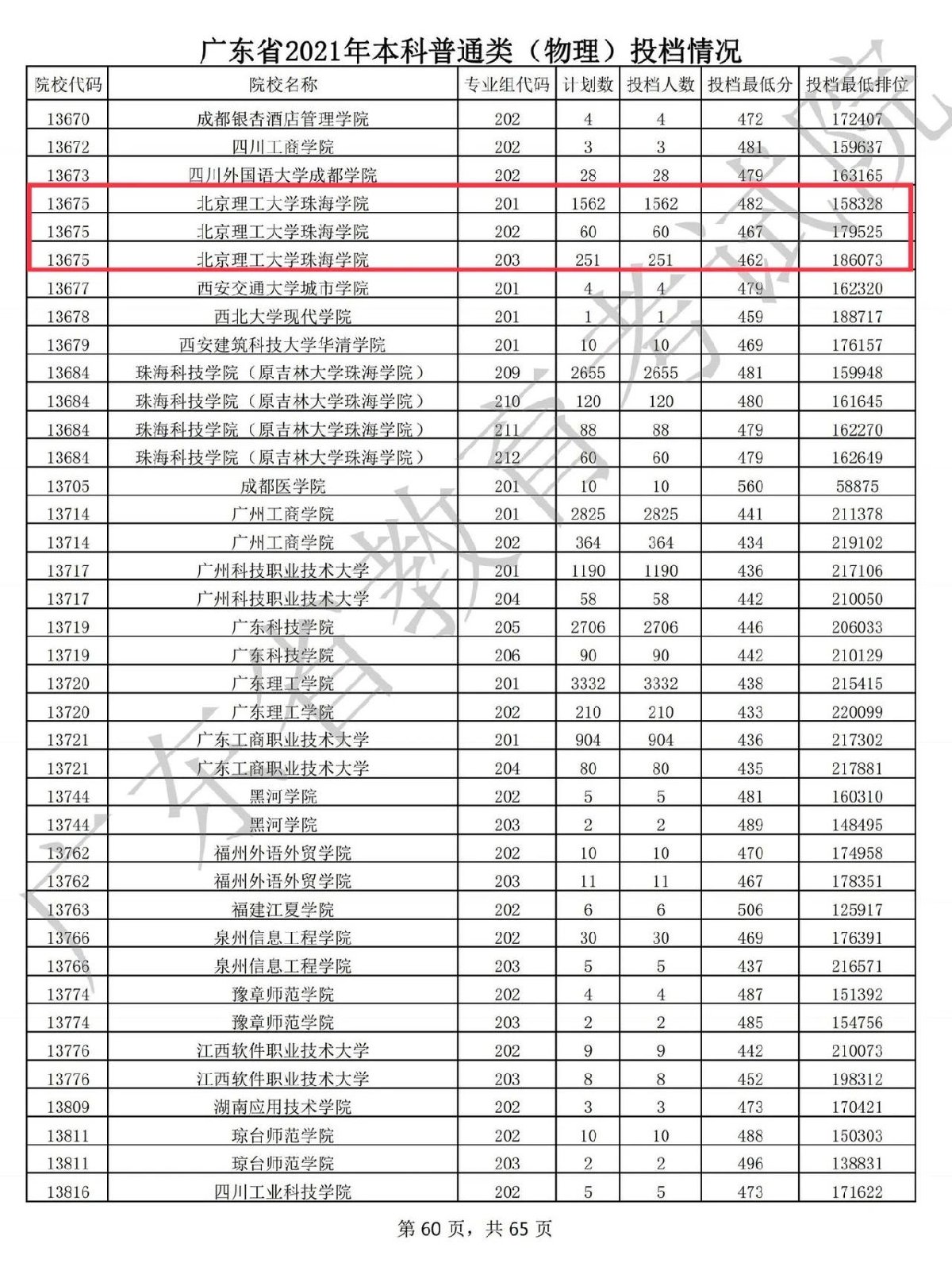 北京理工大学珠海学院2021年广东省本科投档情况