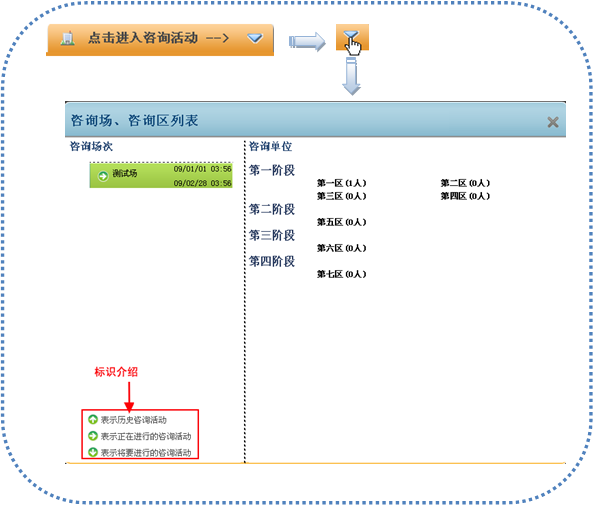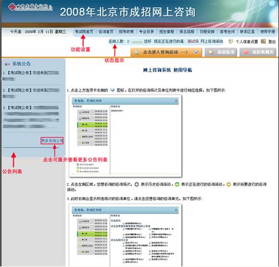 咨询活动界面右侧栏是系统为您提供的网上咨询系统使用导航,为您提供一定的使用说明。您可以按照使用导航为您提供的步骤进行操作,更快的熟悉应用咨询系统。