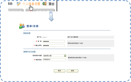 并且为您提供个人信息修改功能,点击个人信息设置,即会转到个人信息修改界面。您可以对您的密码以及密码保护问题进行修改,但其中用户名无法修改。